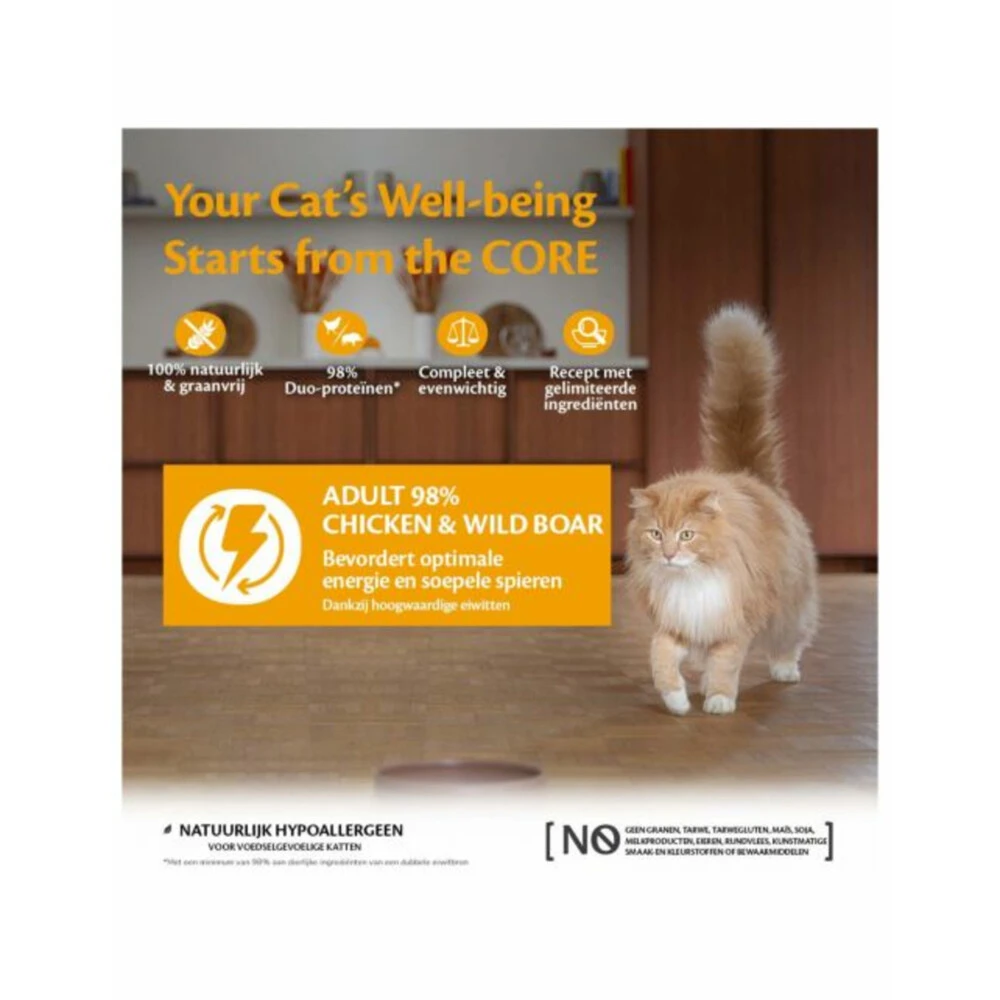 Wellness Core Kattenvoer 98% Recipe Kip – ZwijnWellness Core 98% is een natuurlijke en complete voeding voor volwassen katten. Het natvoer bevat eiwitten die voor minimaal 98% van 2 dierlijke eiwitbronnen afkomstig zijn. Je kat zal deze proteïnerijke voeding niet kunnen laten staan!Natuurlijk hypo-allergeen: bevat GEEN granen, tarwe, gluten, mais, soja, zuivel, kunstmatige kleur-of smaakstoffen en conserveringsmiddelen.98% van de eiwitten komen van 2 dierlijke eiwitbronnenComplete voeding