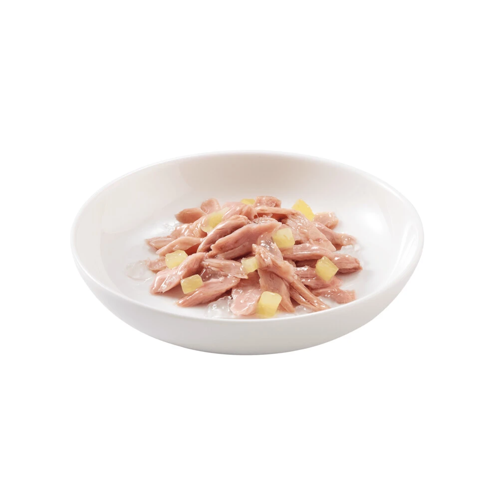 Schesir Kattenvoer Tonijn – Ananas in GeleiHet recept is op basis van echte, heerlijke tonijnfilets gecombineerd met echte stukjes ananas, dorstlessend en gewaardeerd exotisch fruit, voor een smakelijke en originele maaltijd. In gelatine bereid, om de voorkeur tegemoet te komen van katten die houden van een verfijnde, natuurlijke smaak in combinatie met een compactere consistentie in de kom.Schesir is het eerste merk dat echte stukjes fruit toevoegt aan de blikjes kattenvoer, gebaseerd op de stu