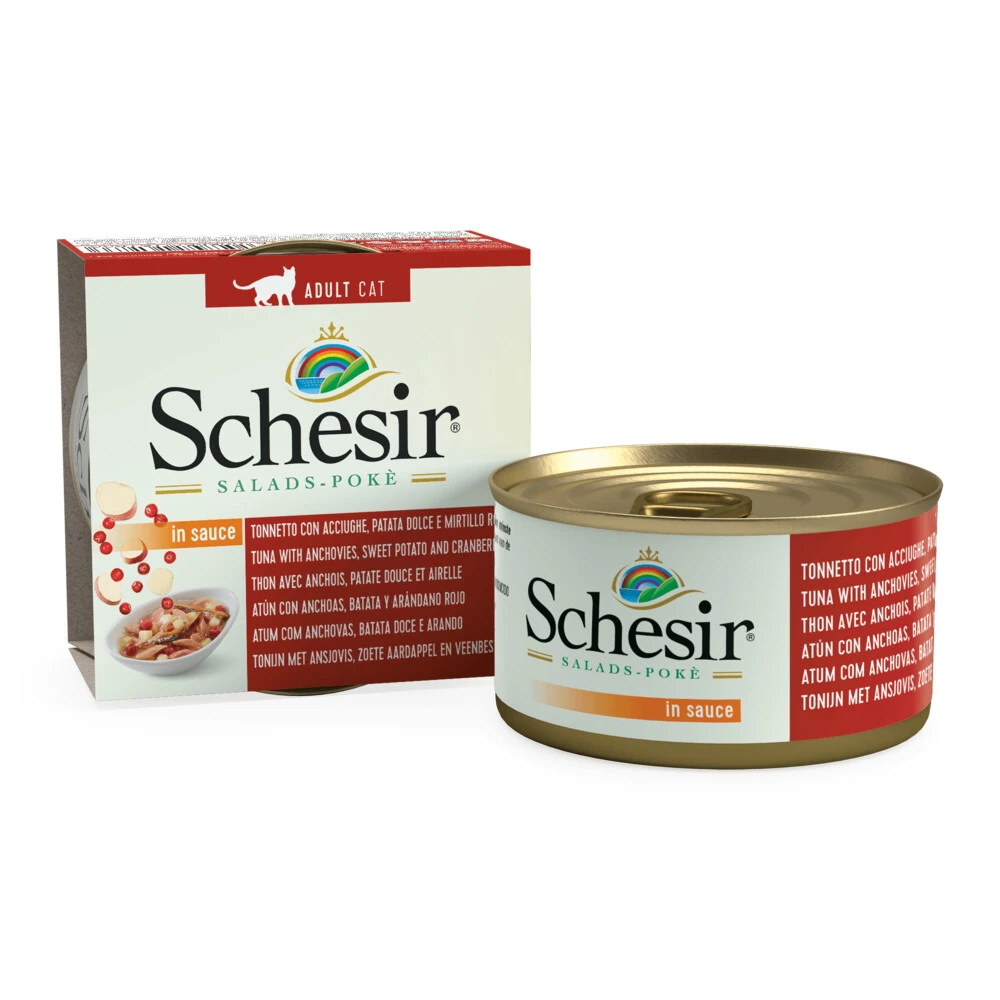 Schesir Kattenvoer Tonijn – Ansjovis – Aardappel in SausEchte tonijnfilets gecombineerd met heerlijke zoete aardappel en rode bosbes, vol antioxidanten, in een romige, onweerstaanbare saus dat het verlangen naar een natuurlijke smaak nog meer zal prikkelen. Een originele combinatie van natuurlijkheid en lichtheid door middel van een verfijnde mix van smaken.Schesir is het eerste merk dat echte stukjes fruit toevoegt aan de blikjes kattenvoer, gebaseerd op de studie u0022u0022Effecten van het o