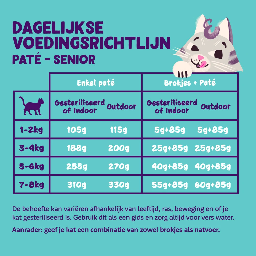 Edgard & Cooper Kattenvoer Senior Pate Kip – KalkoenDe volwaardige vrije-uitloopkip-en-kalkoenpaté bevat geen junkfood en is ideaal voor senior katten. Daarnaast zijn ze zijdezacht en lekker mals. Het recept zonder junkfood zit boordevol magere eiwitten, L-carnitine en taurine. L-carnitine zorgt voor het behoud van spiermassa en taurine helpt de ogen en het hart van jouw senior gezond te houden. Daarbij ook nog een handvol bosbessen, brandnetelblad en wat salie zorgt voor nog mé