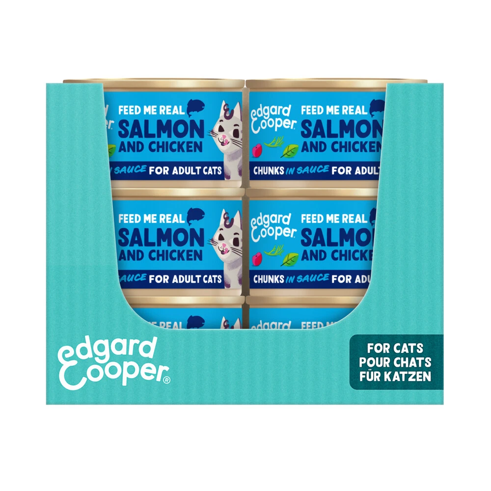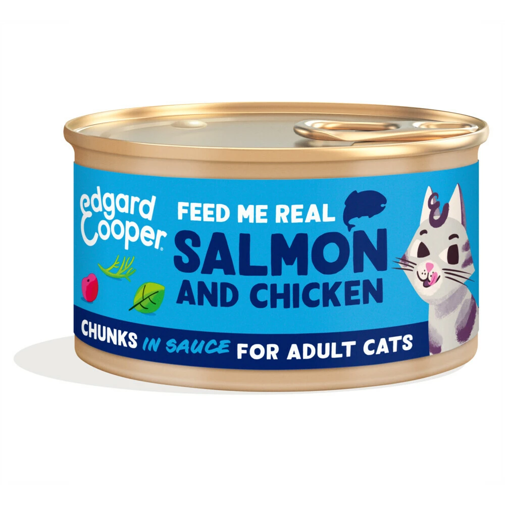 Edgard & Cooper Kattenvoer Chunks Zalm – KipDe sappige stukjes in saus van Edgard & Cooper zijn een feest voor de smaakpapillen van je kat. Dit volwaardige recept zonder junkfood is ideaal voor volwassen katten, óók als ze gesteriliseerd zijn. De smakelijke mix van echte stukjes MSC-zalm en vrije-uitloopkip in een saus om pootjes en snorharen van af te likken, doet je kat spinnen van plezierrr.Edgard & Cooper bereidt recepten met écht eten en met veel aandacht vo