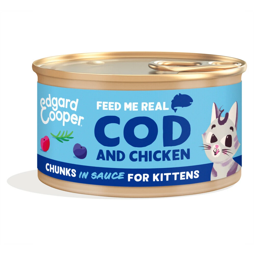 Edgard & Cooper Kattenvoer Kitten Chunks Kabeljauw – Kip De sappige stukjes in saus van Edgard & Cooper zijn allesbehalve junkfood: een volwaardig feest voor opgroeiende kittens, óók als ze gesteriliseerd zijn. De smakelijke mix van MSC-kabeljauw en vrije-uitloopkip geeft je kitten het beste van land en zee. De saus is om pootjes en snorharen (en de bodem van de kom) van af te likken. Dit is écht eten zonder kunstmatige rommel of toegevoegde suiker en boordevol