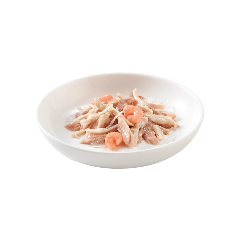 Schesir Kattenvoer Tonijn – Kip – Garnaal in GeleiHet recept is op basis van echte, heerlijke tonijn- en kipfilets gecombineerd met garnalen-topping, de kleine heerlijke schaaldiertjes waar je nooit moe van wordt, voor een originele smaakcombinatie. In gelatine bereid, om de voorkeur tegemoet te komen van katten die houden van een verfijnde, natuurlijke smaak in combinatie met een compactere consistentie in de kom.Tonijn en kip als hoofdbestanddelen gecombineerd met een smaakvolle garnaal-toppin
