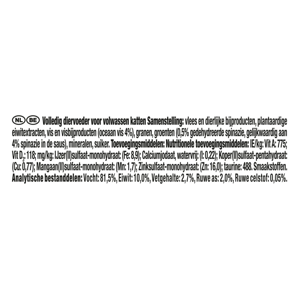 Gourmet Gold met Zeevis en SpinazieGourmet Gold heeft Luxe Mix ontwikkeld, heerlijke recepten om haar verfijnde smaak dagelijks te verwennen met een andere smaakbeleving. Zachte stukjes gecombineerd met zorgvuldig bereide fijne vlokken: de ideale combinatie van twee verschillende texturen in dezelfde maaltijd om jouw kat het genot van een subtiele mix van smaken en texturen te bieden. Luxe Mix met Gourmet Gold, dubbele verwenning voor jouw kat!Met zeevis en spinazieGeen toegevoegde kunstmatige k
