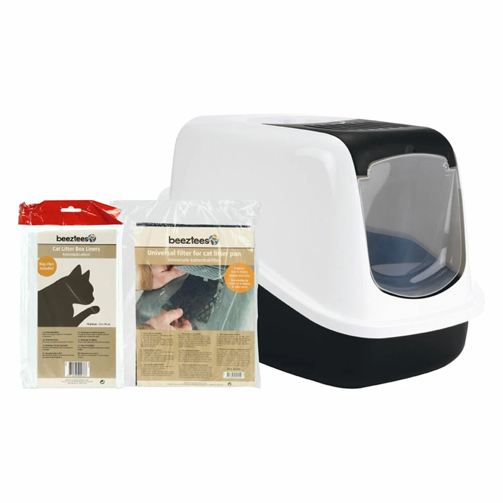 Beeztees Kattenbak PakketDit is de perfecte startpakket voor jouw kat! In dit pakket zijn de volgende producten van Beeztees te vinden: Beeztees Kattenbak Nestor Zwart – Wit, Beeztees Kattenbakzakken 10 stuks en Beeztees Kattenbak Filter Universeel 20 x 30 cm. De Beeztees Nestor Kattenbak is een mooi vormgegeven kattenbak. Bij deze kattenbak is het niet nodig om de gehele bovenkap te verwijderen als je het kattentoilet wilt schoonmaken. Je kunt namelijk het deurtje en het binnenste gedeelte