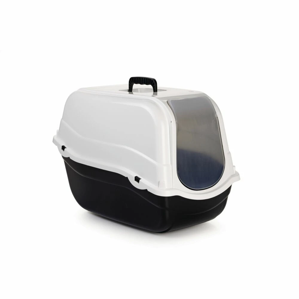 De Beeztees Romeo is een simpele kattentoilet met een zwarte of grijze bak en een witte kap.Met luikje en handvatZonder filter Verkrijgbaar met grijze en zwarte bak