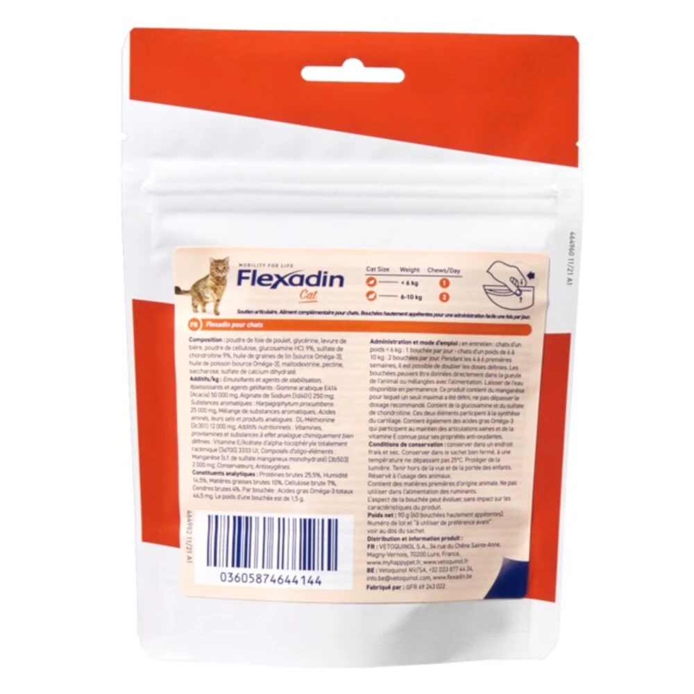 Vetoquinol Flexadin Cat KauwbrokjesFlexadin Cat bevat Glucosamine en Chondroïtine, belangrijke bouwstenen van het kraakbeen en Duivelsklauw (Harpagophytum procumbens), een geneeskrachtige plant waarvan het wortelextract al heel lang gebruikt wordt om de gewrichten te ondersteunen.De zorgvuldig uitgekozen natuurlijke ingrediënten ondersteunen de gewrichten van katten en houden ze soepel. Bovendien is Flexadin ook zeer makkelijk te geven. De smakelijke, zachte kauwbrokjes kunnen al