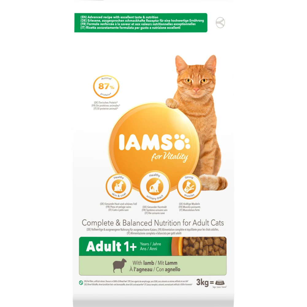 Iams Kat Adult Lam 3 kgIams for Vitality met lam voor volwassen katten is een 100% complete en uitgebalanceerde specialistische voeding om de gezondheid en vitaliteit van jouw kat op 7 punten te ondersteunen, waardoor jouw kat zal stralen met een glanzende vacht en gezonde huid. Dit alles zit in een heerlijk recept met 87% dierlijke eiwitten (van het totale eiwitgehalte), waar jouw huisdier elke dag weer van kan genieten.Voor volwassen katten van 1 tot 6 jaar87% dierlijke eiwitten