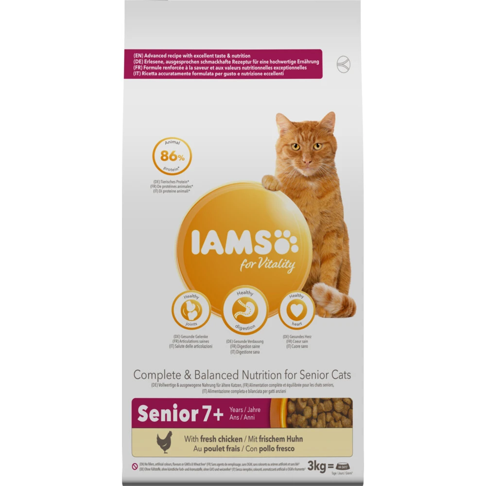 Iams Kat Senior Kip 3 kgIams for Vitality met verse kip voor senior katten is een 100% complete en uitgebalanceerde specialistische voeding om de gezondheid en vitaliteit van jouw kat op 7 punten te ondersteunen, waardoor jouw kat zal stralen met een glanzende vacht en gezonde huid. Dit alles zit in een heerlijk recept met 88% dierlijke eiwitten (van het totale eiwitgehalte), waar jouw huisdier elke dag weer van kan genieten.Oudere en senior katten vanaf 7 jaar88% dierlijke eiwitten