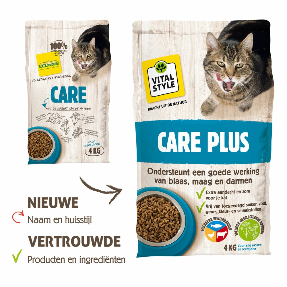 VITALstyle Kattenvoer Care Plus VITALstyle (voorheen ECOstyle) care plus kattenbrokjesVITALstyle (voorheen ECOstyle) care plus kattenbrokjes is een extra ondersteuning voor alle katten. Care plus volledige kattenvoeding van VITALstyle (voorheen ECOstyle) bevat alles wat een kat nodig heeft en is geschikt voor katten van alle leeftijden. Voor een goede gezondheid van je kat is een actieve, goed werkende spijsvertering onmisbaar. De goed verteerbare ingrediënten in care plus van VITALsty