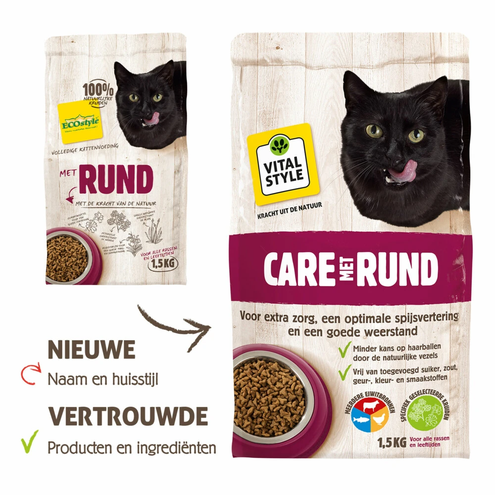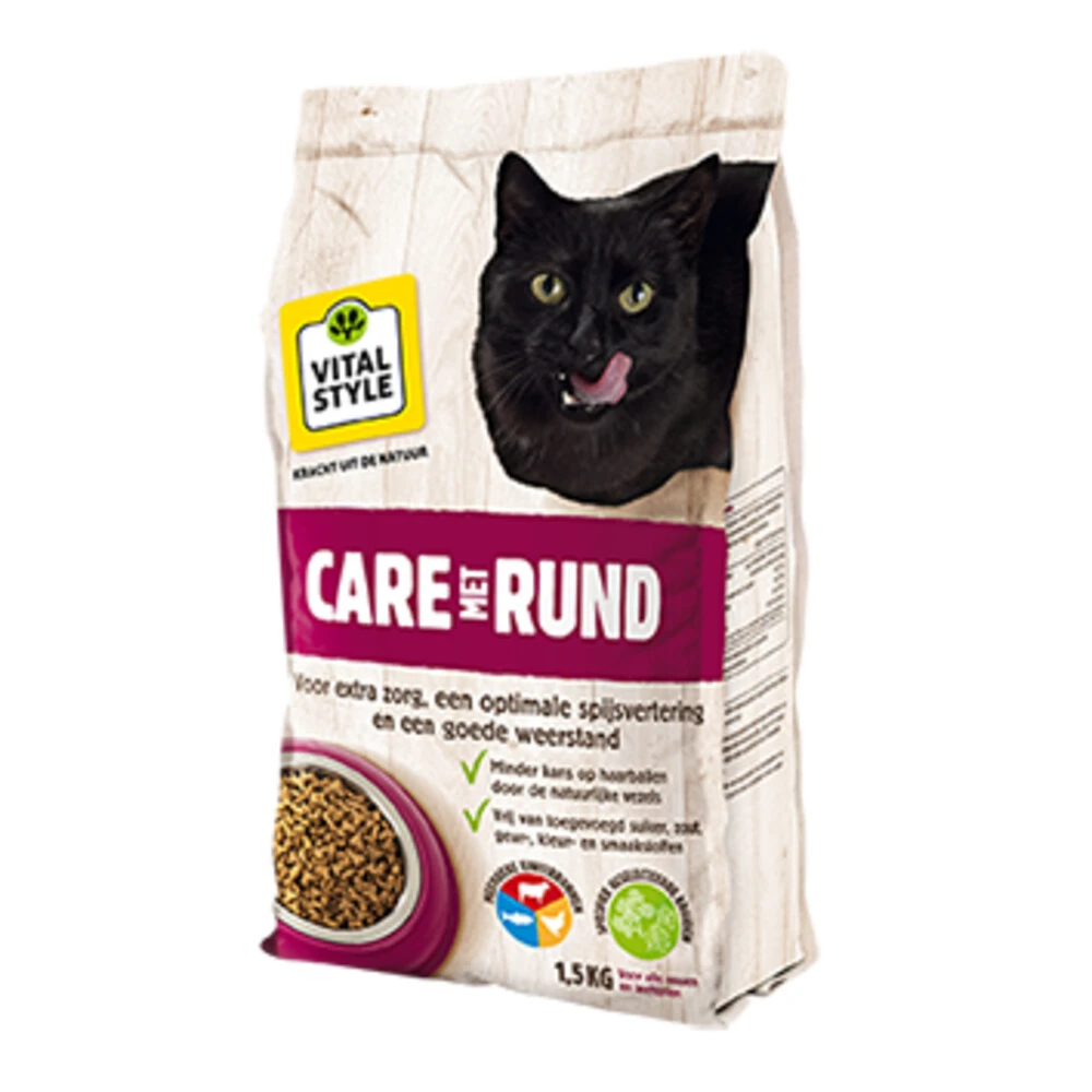 VITALstyle Kattenvoer Care Rund VITALstyle (voorheen ECOstyle) care met rund kattenbrokjesVITALstyle Kattenvoer Care Rund bevat alles wat je kat nodig heeft, van jong tot oud. Voor een goede gezondheid van je kat of kitten is een actieve, goed werkende spijsvertering belangrijk. De goed verteerbare ingrediënten in de voeding zorgen voor een actieve spijsvertering. Door de vezels in de voeding verlaten de kattenharen op een natuurlijke manier het lichaam. De zalmolie heeft een gunstige