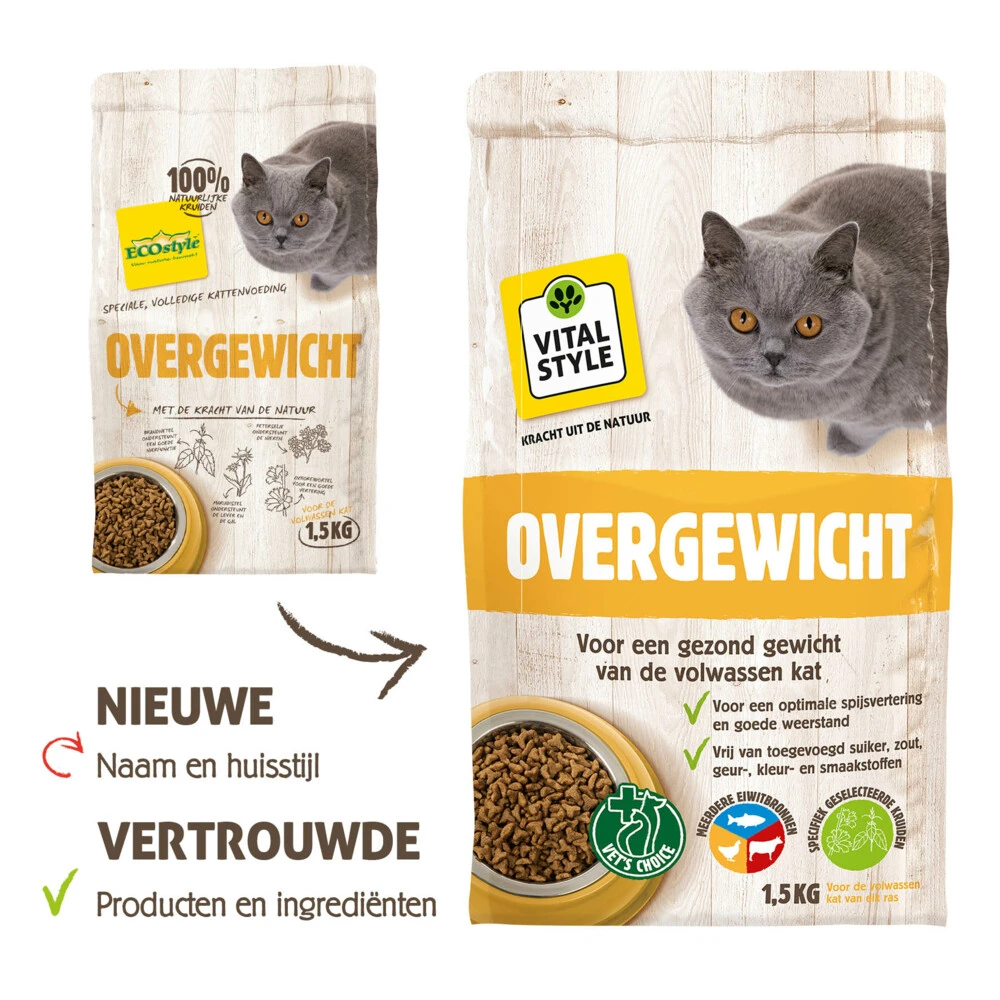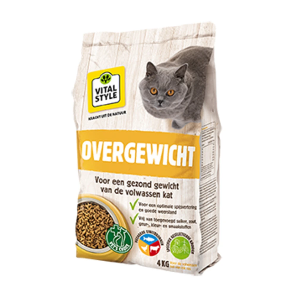 VITALstyle Kat OvergewichtVITALstyle (voorheen ECOstyle) overgewicht kattenbrokjes: een volledige dieetvoedingVITALstyle Kat Overgewicht is voor een gezond lichaamsgewicht. Het vermindert overgewicht bij je kat. Je kunt de voeding gebruiken totdat het gewenste lichaamsgewicht bereikt is.VITALstyle Kat Overgewicht is een volledige dieetvoeding die stimuleert dat je kat afvalt en zorgt tegelijk voor een verzadigd gevoel. De voeding heeft een laag vetgehalte, een hoog gehalte aan ruwe celstof en ee